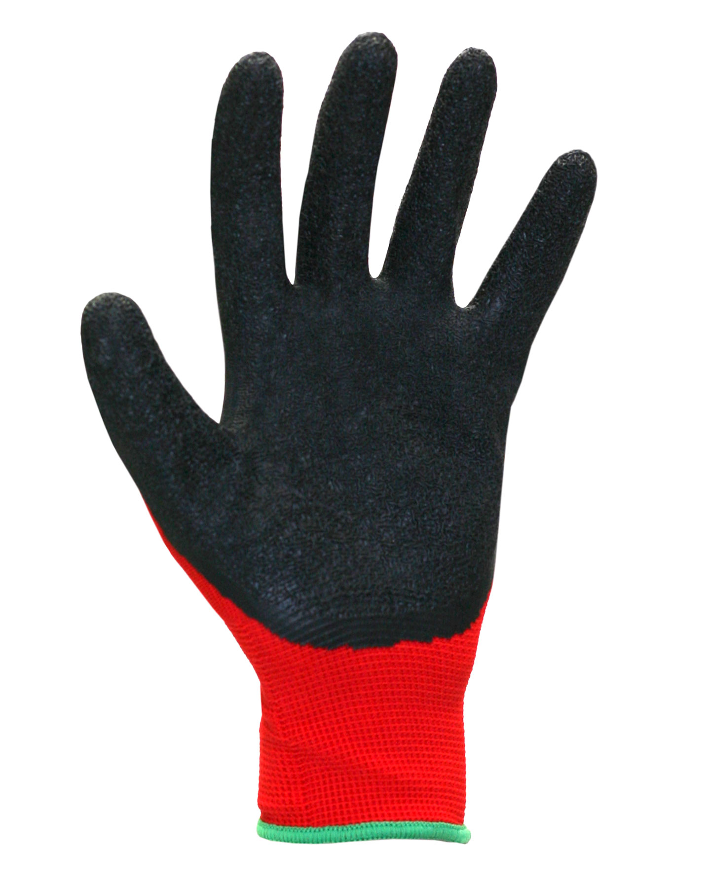 Перчатки из 100% нейлона, 13 кл. вязки, цвет красный. Рифленое латексное покрытие черного цвета. Хорошая защита от истирания и разрыва. Повышенная стойкость покрытия к кислотам и щелочам. Отличная воздухопроницаемость, широкий диапазон применения. Цветной оверлок. р. 7,8,9,10, в уп.240пар