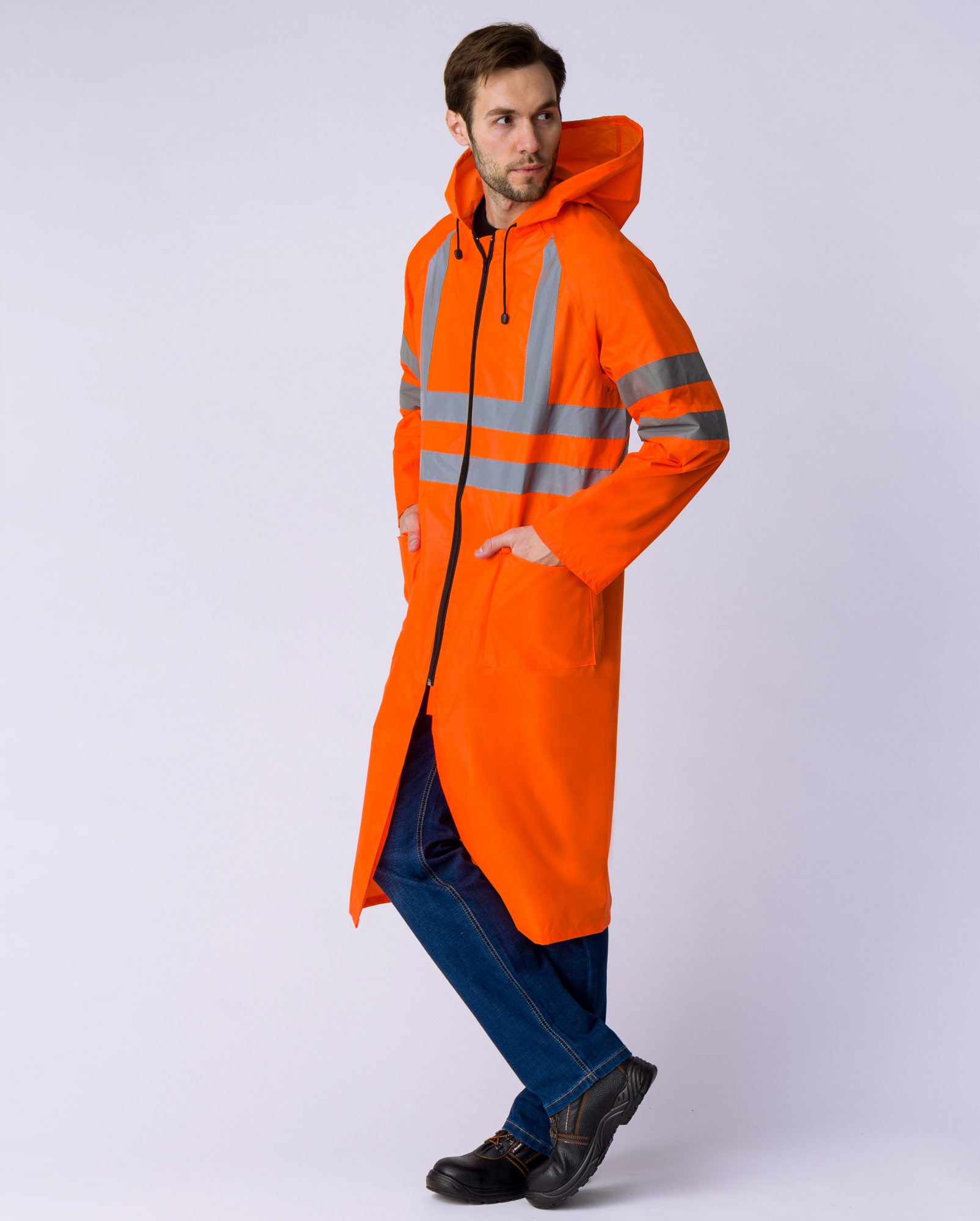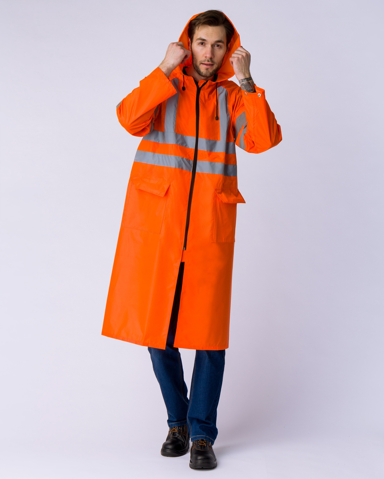 Влагозащитный плащ повышенной видимости с капюшоном и двумя карманами с клапанами.