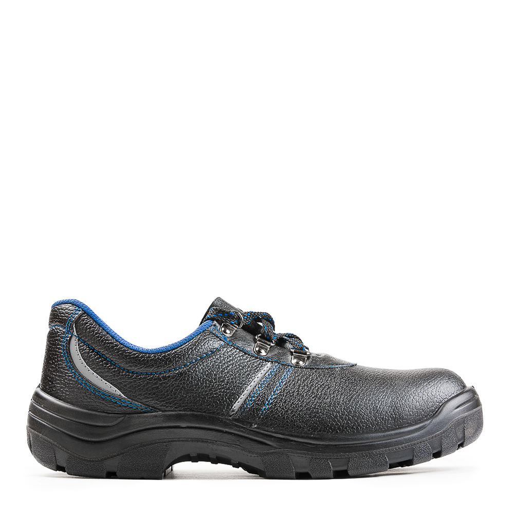 Полуботинки изготовлены методом литья подошвы к заготовке верха обуви. Имеется пристроченная прилитая задинка. Верх полуботинок из кожи. Подкладка полуботинок из текстильного материала, стойкого к истиранию и отводящего влагу от стопы. В верхней части полуботинок мягкий кант. Полуботинки завязываются на шнурки и имеют глухой клапан. Шнуровка с использованием металлических люверсов. Стелька вкладная. В носочной части термопластичный подносок. На боковинах выполнены фигурные световозвращающие элементы в виде полосок для лучшей видимости работника. Выполнена контрастная отстрочка синего цвета в тон цвета подкладки. Подошва однослойная, полиуретановая, маслобензостойкая (устойчива к воздействию агрессивной среды: нефть, масла, нефтепродукты, щелочи концентрацией до 20%, кислоты концентрацией до 20%). Есть внутренняя амортизирующая вставка в пяточной части подошвы. Глубина профиля ходового слоя подошвы составляет 3,5 мм. Цвет полуботинок черный.