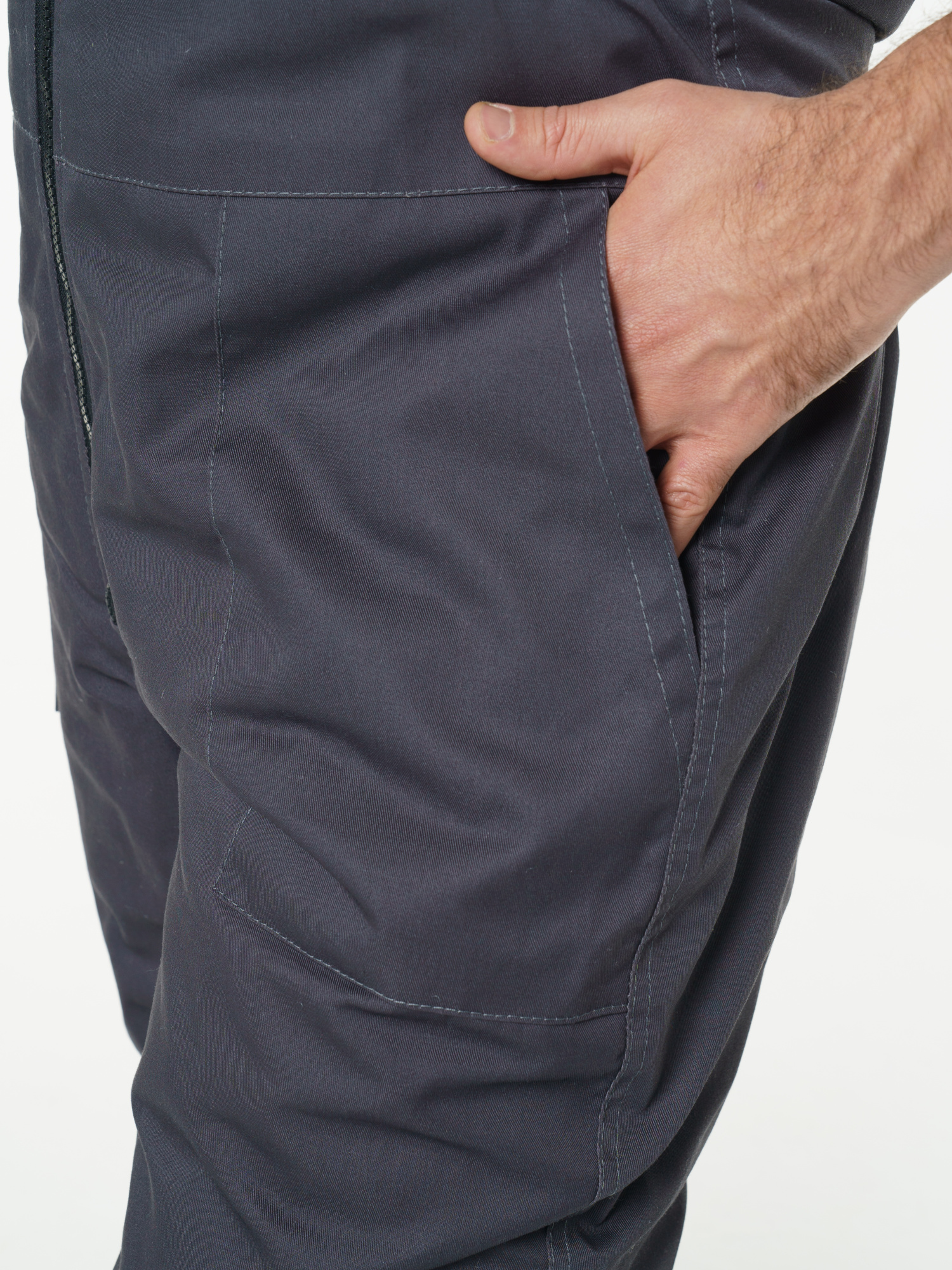 Полукомбинезон прямого силуэта с центральной застежкой на молнию. С высокой грудкой и спинкой, на регулируемых бретелях с резинкой и фастексами. Объемные боковые накладные карманы с косым входом. По талии спинки кулиса на резинке. Усилительные вставки в зоне коленей с возможностью установить наколенники.