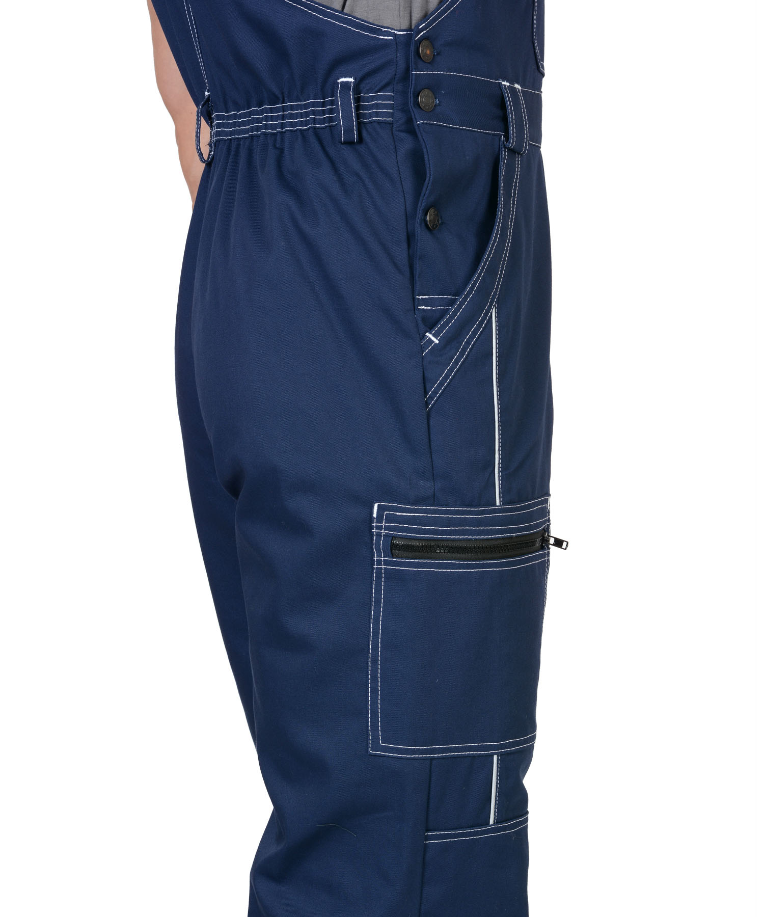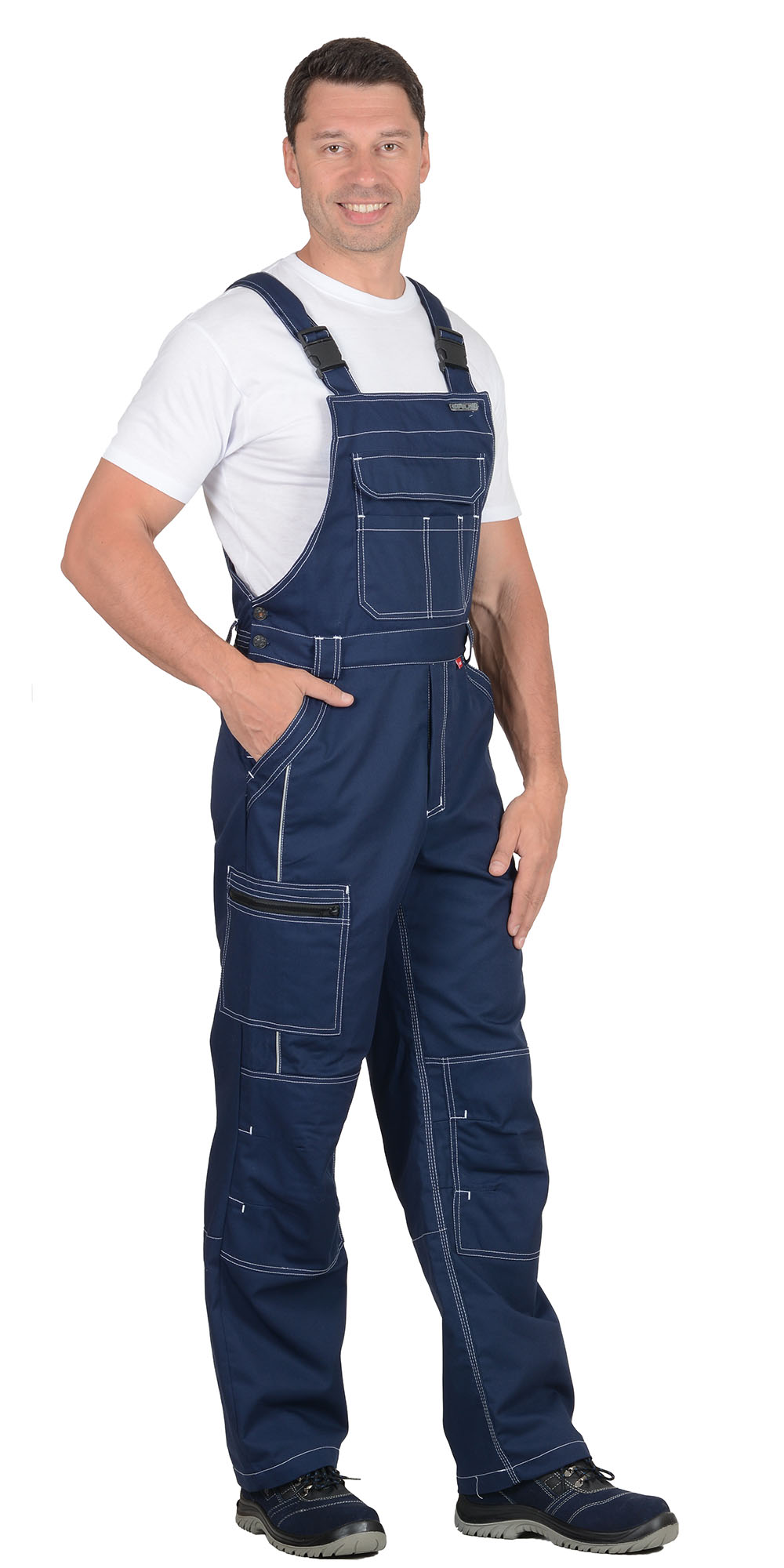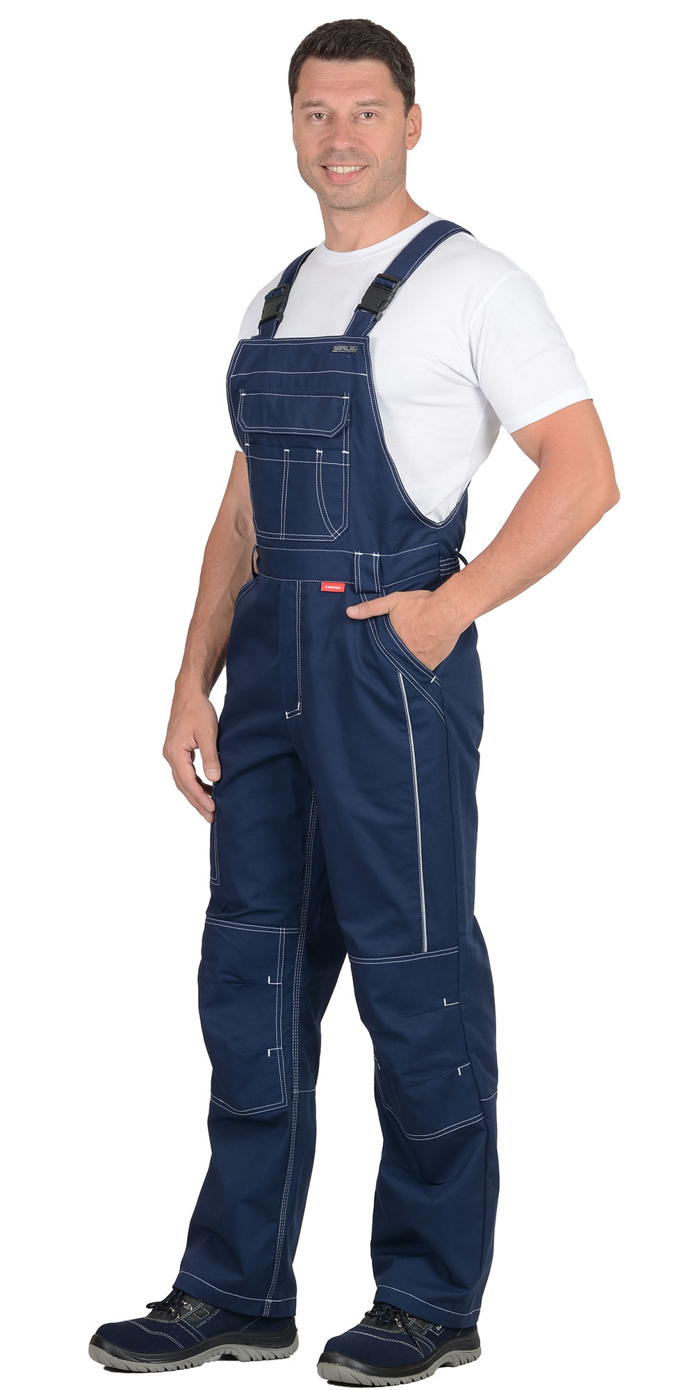 Полукомбинезон прямого силуэта, застежкой гульфика на молния, с различными многофункциональными карманами, с застежкой в правом боковом шве на пуговицы, с наколенниками, с бретелями регулируемыми эластичной тесьмой и фастексами, с эластичной тесьмой по линии талии, на передних половинках в рельеф вшивается СВ кант.