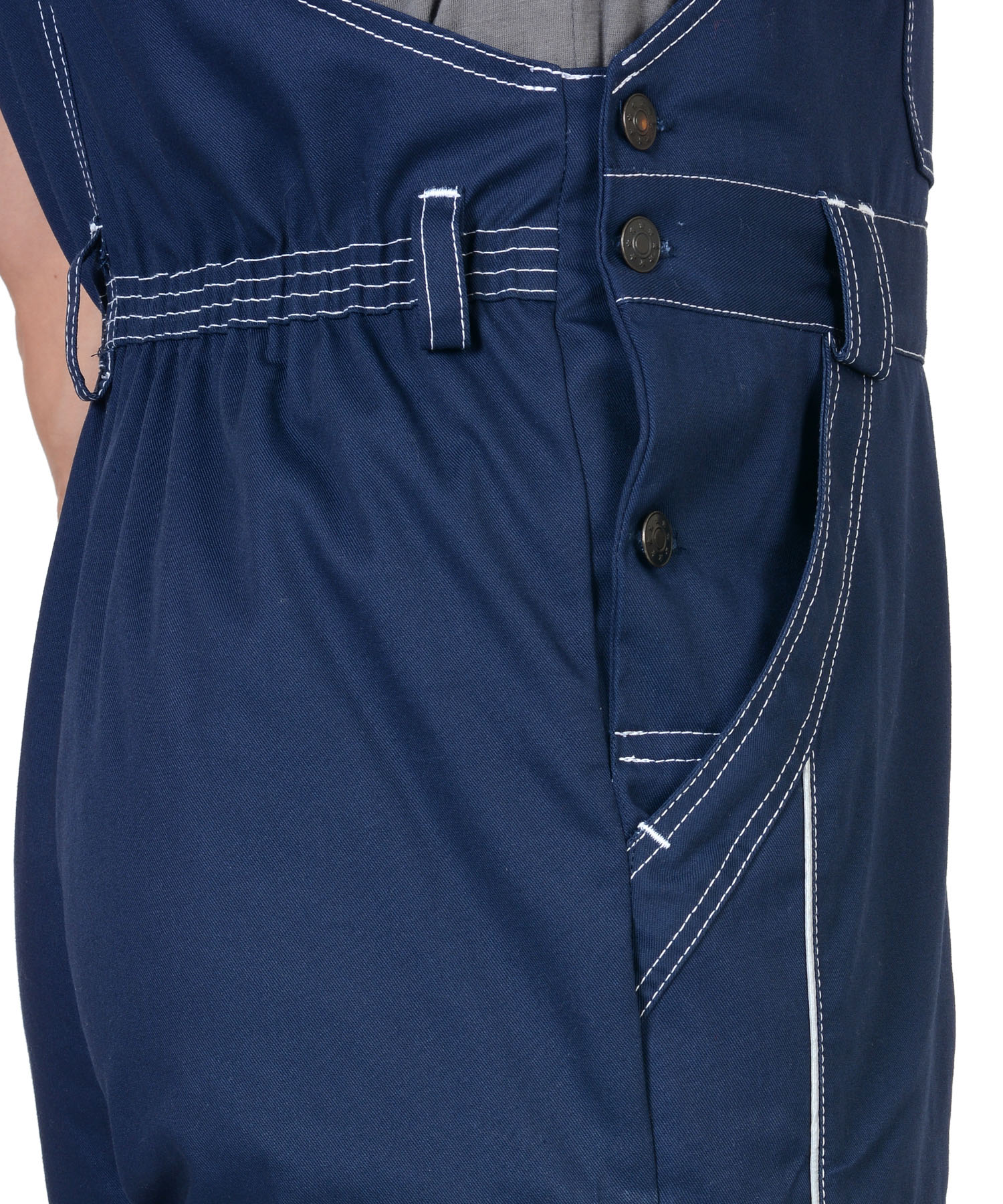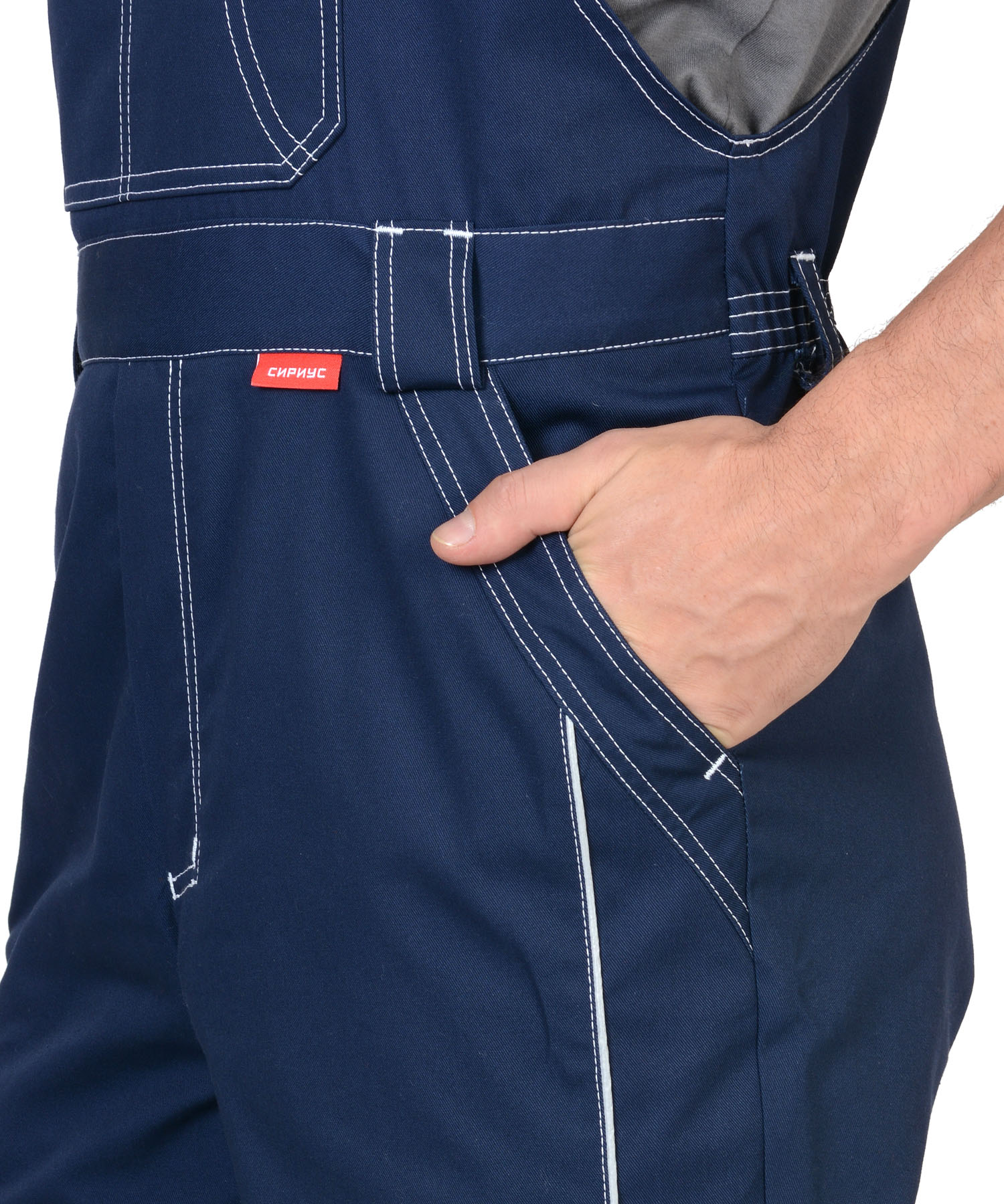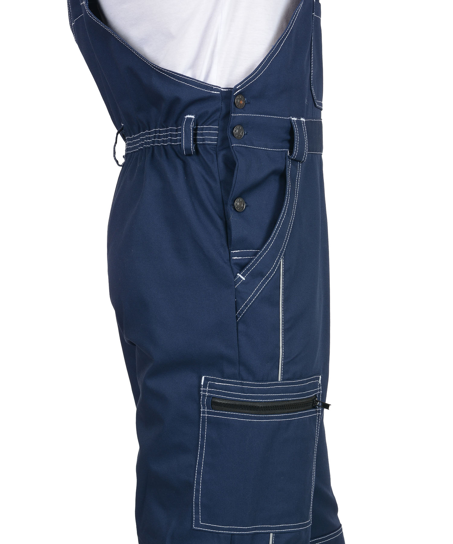 Полукомбинезон прямого силуэта, застежкой гульфика на молния, с различными многофункциональными карманами, с застежкой в правом боковом шве на пуговицы, с наколенниками, с бретелями регулируемыми эластичной тесьмой и фастексами, с эластичной тесьмой по линии талии, на передних половинках в рельеф вшивается СВ кант.