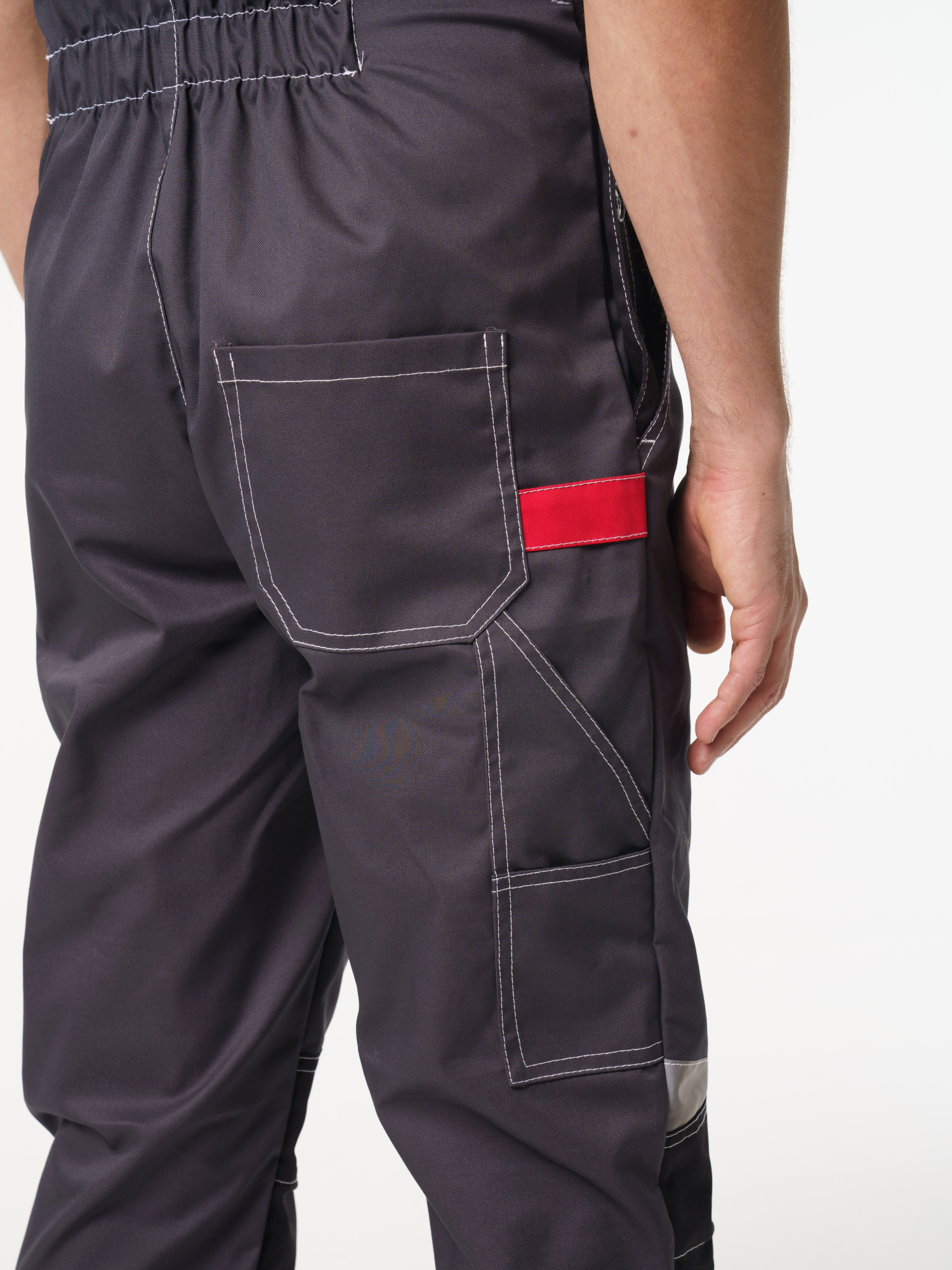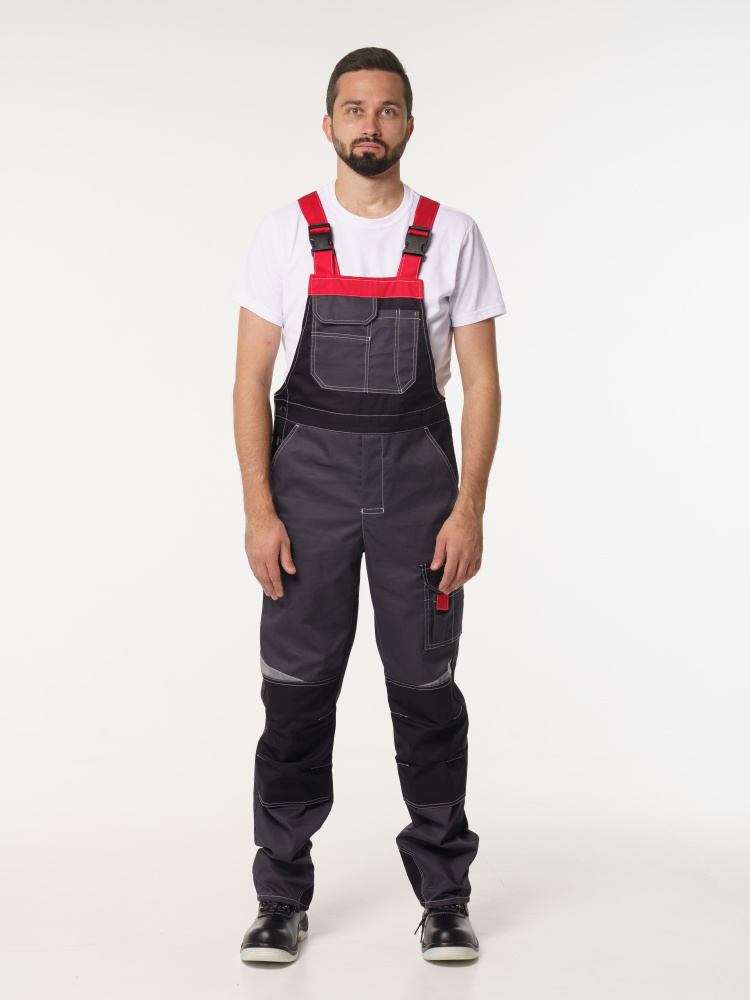 Полукомбинезон с застёжкой гульфика на молнию и застёжкой в боковом шве на пуговицы; с различными многофункциональными карманами; с объемными наколенниками; есть СОП фигурной формы .