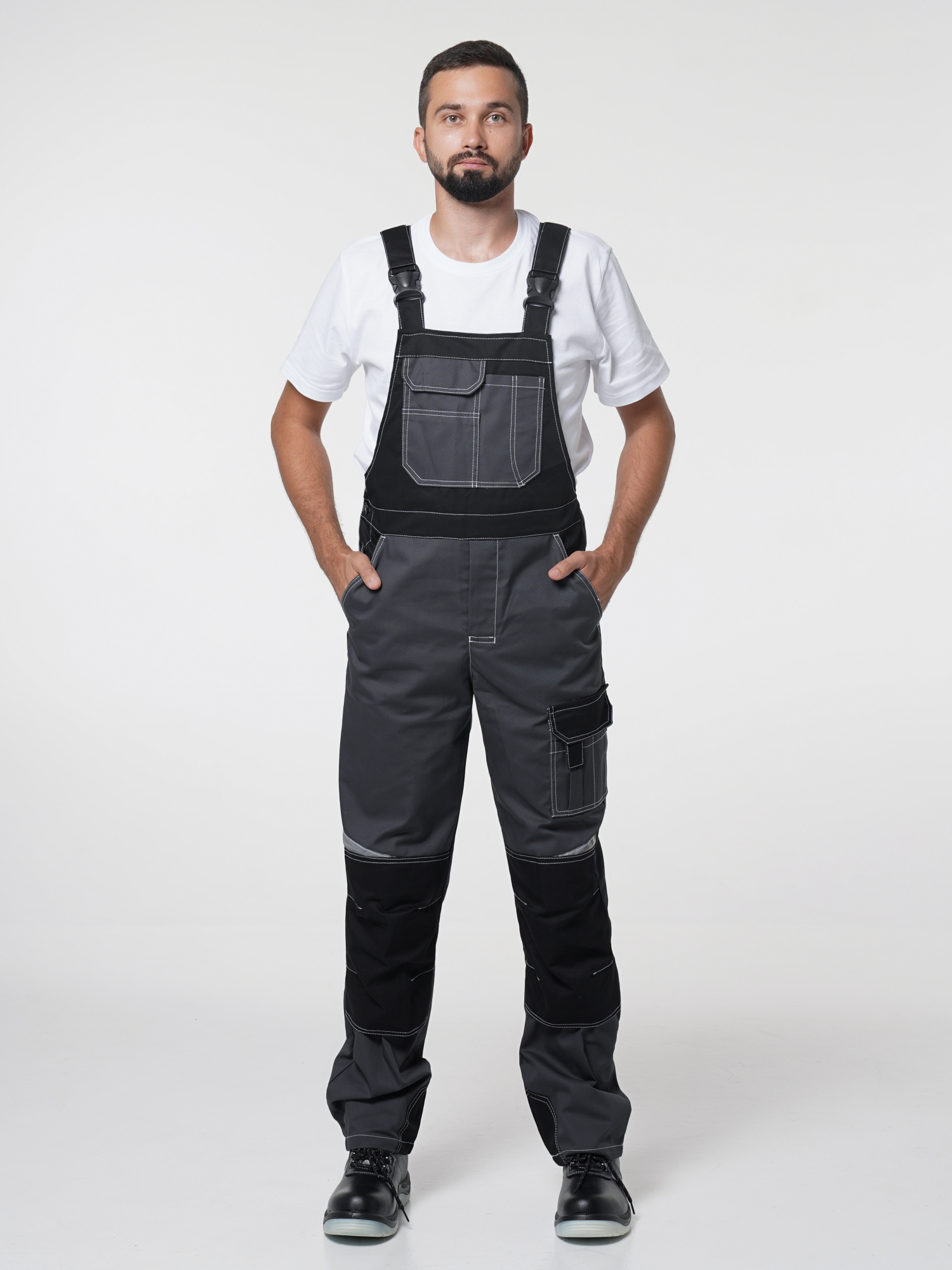 Полукомбинезон с застёжкой гульфика на молнию и застёжкой в боковом шве на пуговицы; с различными многофункциональными карманами; с объемными наколенниками. СОП-50 мм.