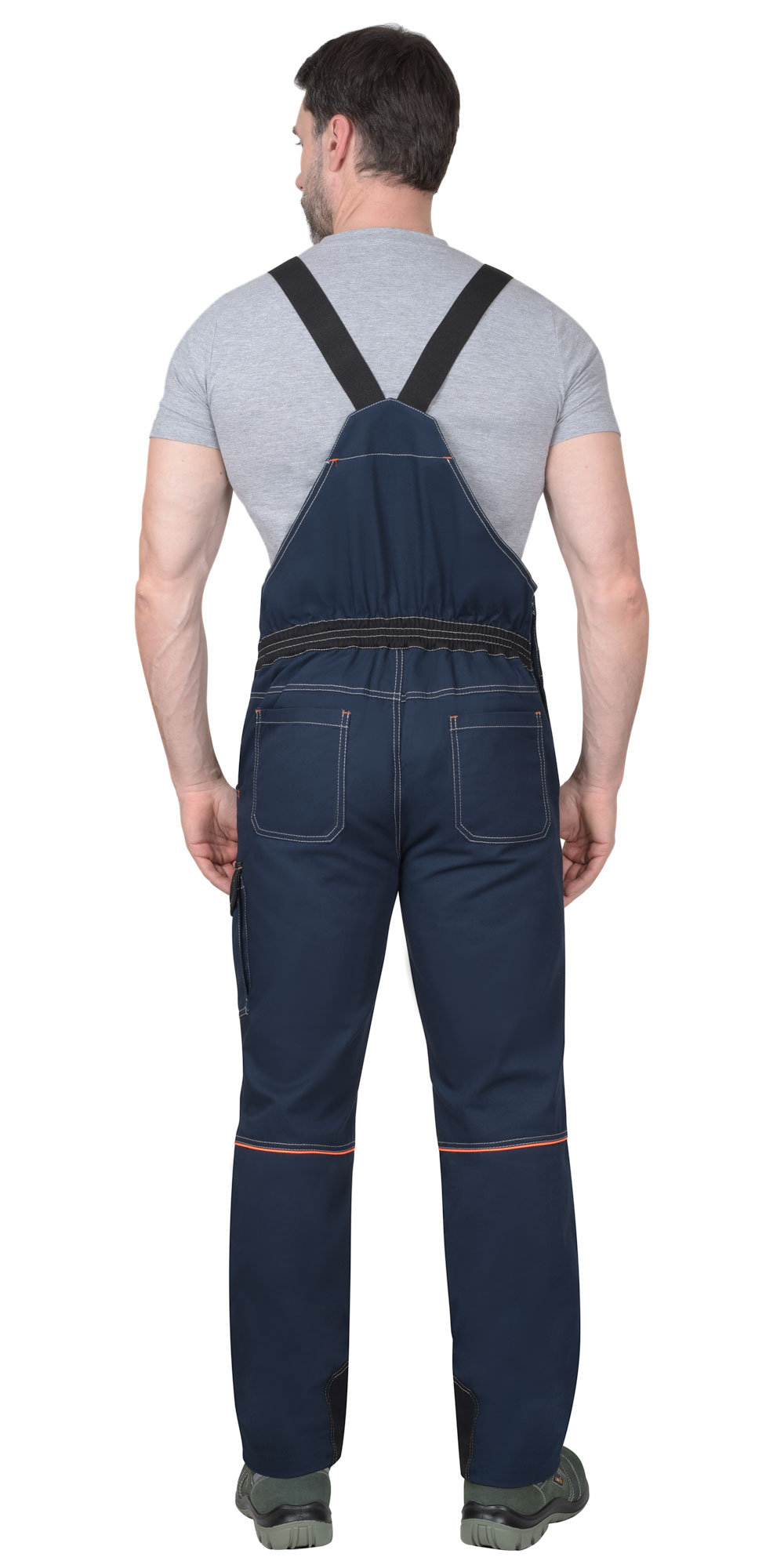 Полукомбинезон с застежками: гульфик на молнию, левая боковая на кнопки. На грудке многофункциональный комбинированный карман с клапаном на липучку. Передние половинки с боковыми внутренними карманами и объемными наколенниками. На левом боковом шве накладной полуобъемный карман с фигурным клапаном на липучку. Задние половинки с кантом контрастного цвета, кокеткой и накладными фигурными карманами. По шаговым швам брюк усиленные фигурные накладки. Пояс брюк с широкими шлевками. По шаговым швам полукомбинезона усиленные фигурные накладки. По спинке на всю ширину резинка для лучшего прилегания. Полукомбинезон с бретелями из резинки, длина регулируется застежкой-фастексом.