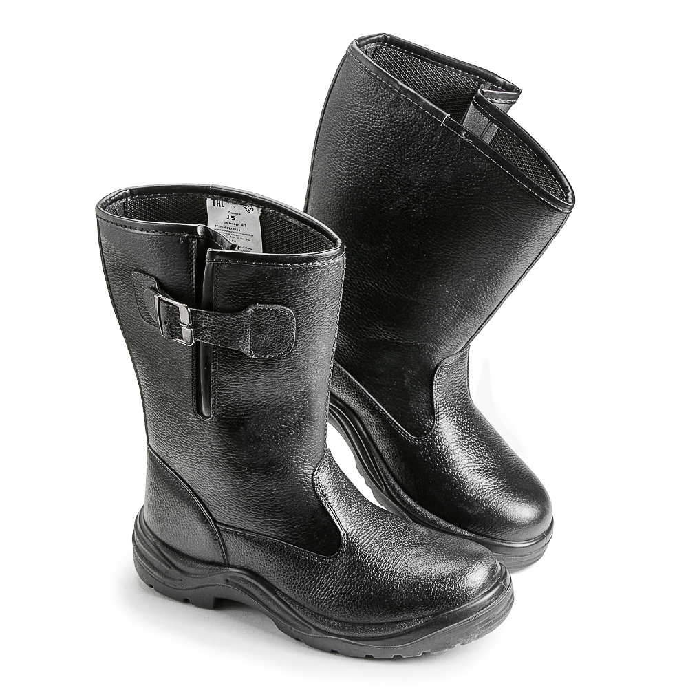 Сапоги изготовлены методом прямого литья подошвы к заготовке верха обуви. Имеется пристроченная прилитая задинка. Верх сапог изготовлен из кирзы, союзка, носок и задинка – из кожи. По верху выполнена окантовка. Стелька вкладная. С внешней стороны голенища выполнен клапан и регулировка по ширине с использованием притачных ремней и металлической пряжки. Голенище имеет высоту 28 см. В носочной части стопы выполнен термопластический подносок. В передней части имеются фигурные световозвращающие элементы для лучшей видимости работника в условиях недостаточной освещенности. Подошва однослойная, полиуретановая, маслобензостойкая (устойчива к воздействию агрессивной среды: нефть, масла, нефтепродукты, щелочи концентрацией до 20%, кислоты концентрацией до 20%). Есть внутренняя амортизирующая вставка в пяточной части подошвы. Цвет сапог – черный.