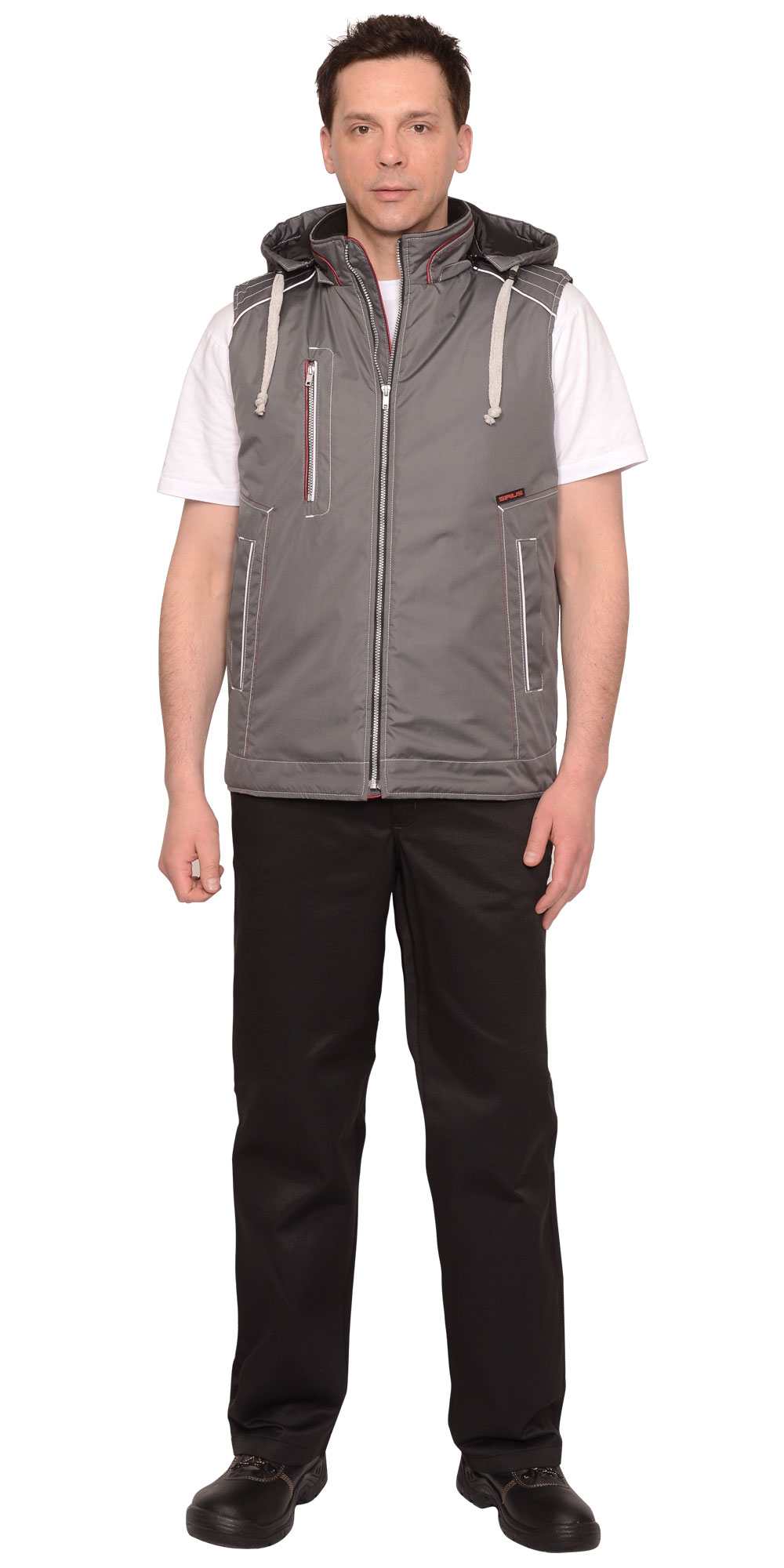 Жилет, с утеплённой подкладкой, однотонный с отделочными строчками и отделочным кантом контрастного цвета. Жилет с воротником стойка, с застёжкой на молнию, с внутренним ветрозащитным клапаном, со съёмным капюшоном, который пристёгивается к воротнику на молнию. Спинка жилета, удлинённая с фигурной линией низа. Жилет с одним нагрудным карманом с молнией и двумя нижними боковыми карманами. Внутренний воротник из флиса. Объём капюшона по лицевому вырезу регулируется шнуром с фиксаторами. Подкладка с утеплителем, с внутренним карманом с молнией. В жилете предусмотрен световозвращающий кант, что обеспечивает видимость при любом освещении.