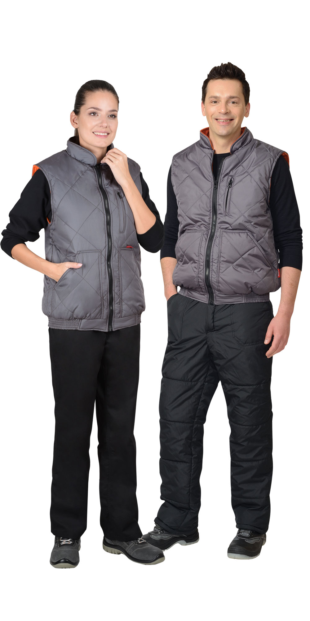 Жилет утеплённый, стёганный, на подкладке из флиса с центральной бортовой застёжкой на молнию, с воротником стойка, с нагрудным карманом с молнией и нижними фигурными утеплёнными карманами.