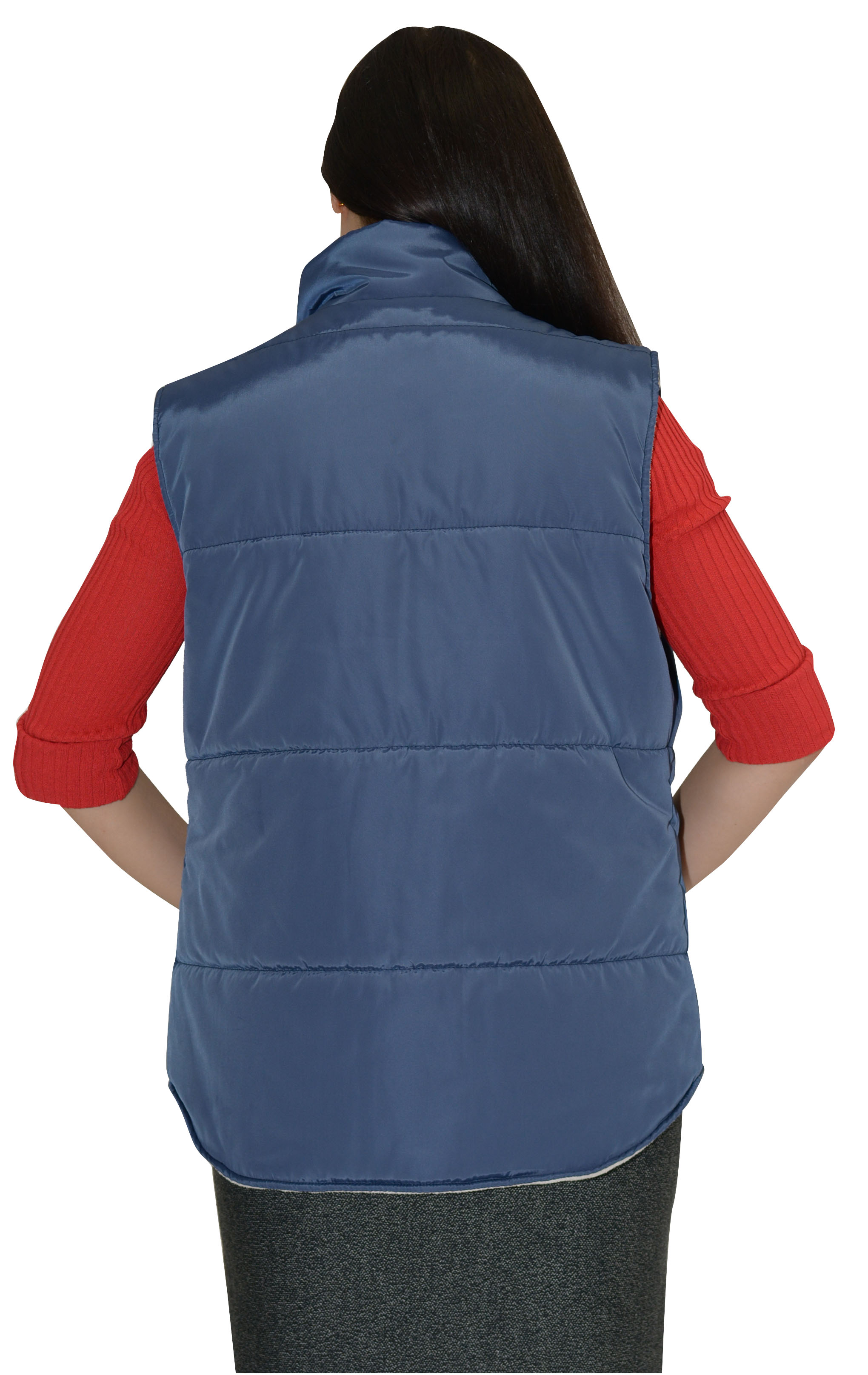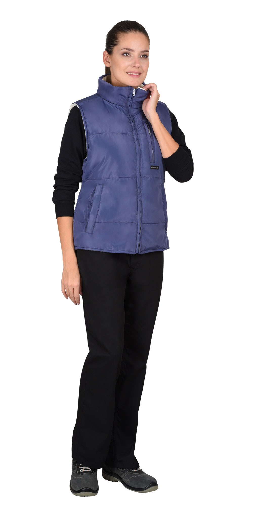 Жилет женский утепленный, стеганный, на подкладке из ткани флис, полуприлигающего силуэта, с воротником стойка, с центральной бортовой застежкой на тесьму- "молния", с проезными карманами "листочка", с верхним прорезным карманом