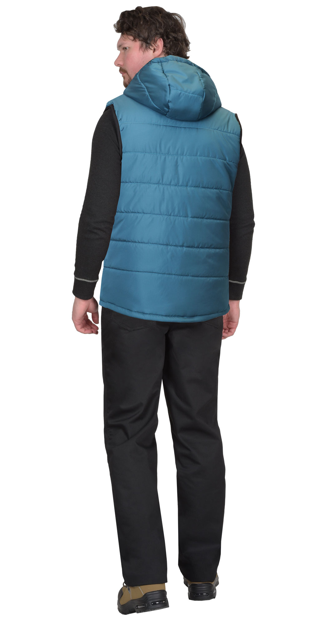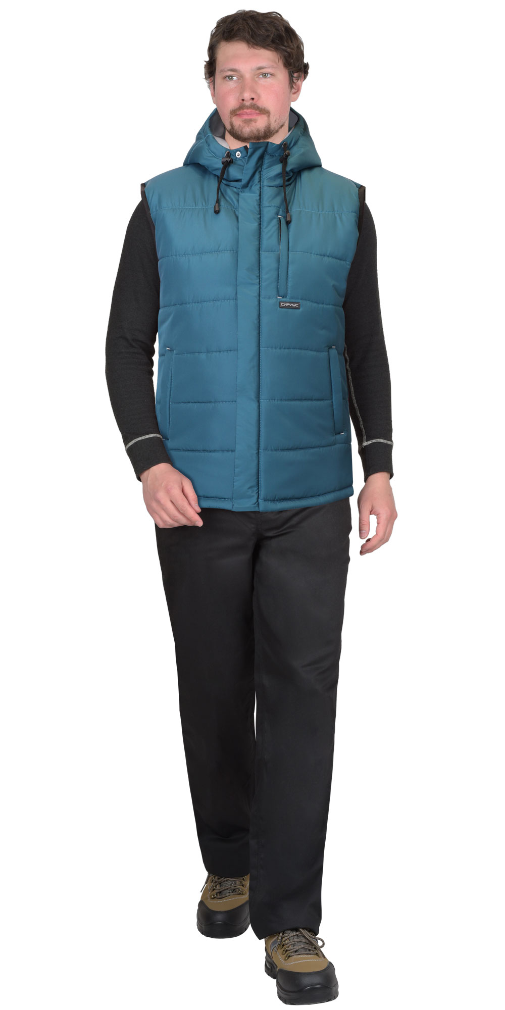 Жилет утеплённый, выстеган с утеплителем горизонтальными строчками, на подкладке, с втачным капюшоном, с застёжкой на молнию, закрытую ветрозащитным клапаном от края капюшона до низа изделия, застёгивающимся на кнопки. Жилет с одним нагрудным карманом с молнией и двумя нижними карманами. Спинка жилета, удлинённая с фигурной линией низа. Пройма окантована резинкой. Объём капюшона по лицевому вырезу регулируется шнуром с фиксаторами.
